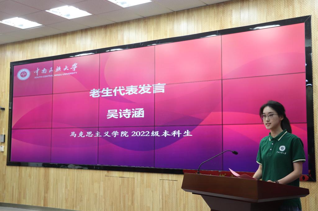 2022级本科生吴诗涵代表在校生作了发言。她以自身在双创基地参加专家组集训的经历为例,鼓励学弟学妹们跳出舒适圈,充分利用学校和学院提供的资源和机会,将专业知识与社会实践相结合,努力成长为国家和社会需要的时代新人。