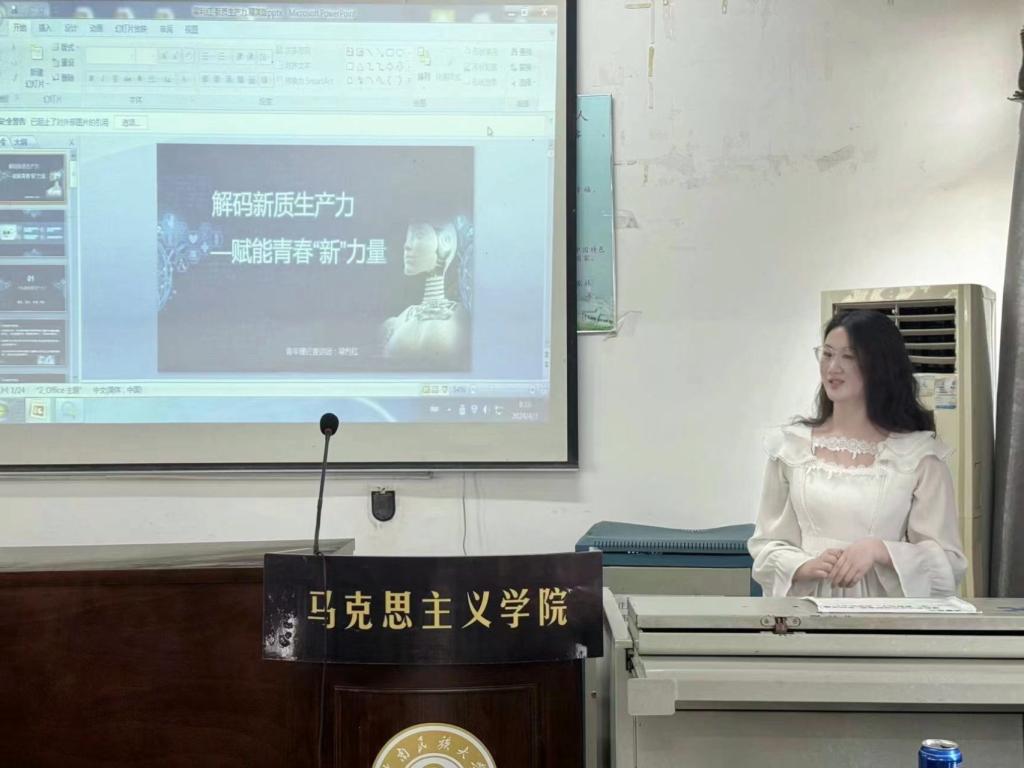 梁利红围绕政府工作报告中的热点——新质生产力展开了宣讲。她对新质生产力的发展历史、内涵、定义、特征等进行了解读,并将其与传统生产力进行对比,生动阐述新质生产力的时代性与进步性。随后,她从国家发展与个人生活两个层面,对发展新质生产力的必要性与重要性进行了说明。梁利红表示,国家应为新质生产力蓄势赋能,从多方面入手;全社会多主体应共同努力,把握发展大趋势;青年应不断朝着高标准、高要求、高素质方向发展,为国家发展贡献青春力量。