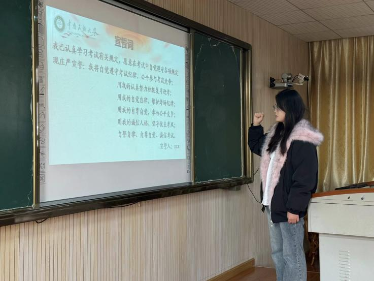 随后,在思政专业2024级安怡炫同学的带领下,全体参会学生举起右拳,庄严宣誓,表示要“以声为誓,以行为诺”,端正态度,诚信应考,以实际行动助力学院学风考风建设。