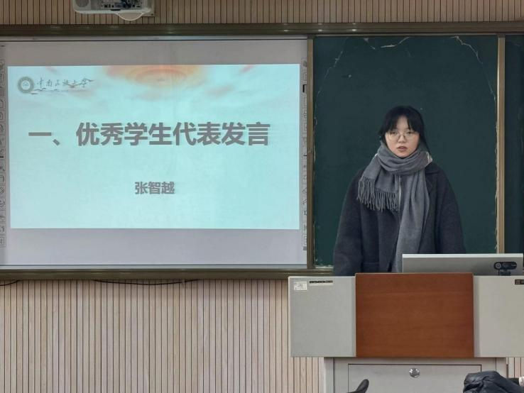 在主题分享环节,思政专业2023级张智越同学从学习方式和学习心态两方面分享了备考经验。她认为,一方面,要掌握正确的复习方法,在复习备考的过程中,需建立在理解的基础上,梳理、掌握知识框架,再对细节进行记忆;另一方面,在备考时进行积极的自我暗示,保持平和的心态,提高学习专注力,有效保障高效复习。思政专业2023级赵书梅同学领学了学校关于端正学风考风的制度、规定及奖惩措施,明确考试纪律要求,强调考试诚信的重要性。
