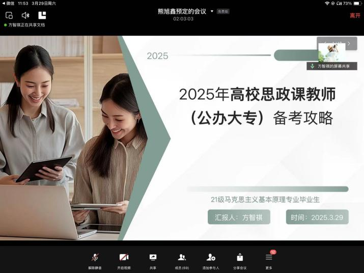 为帮助研究生同学更好地了解就业现状、明确职业规划、应对就业挑战、提升求职技能,3月29日,我院举办优秀研究生毕业生线上就业分享会,邀请我院2024届优秀毕业生何靖珂、李玥佳、占燚、马超、方智祺、吴巧诗作求职就业分享。研究生辅导员李明轩老师及我院全体研究生参加分享会,会议由院研究生会主席团成员熊旭鑫主持。
