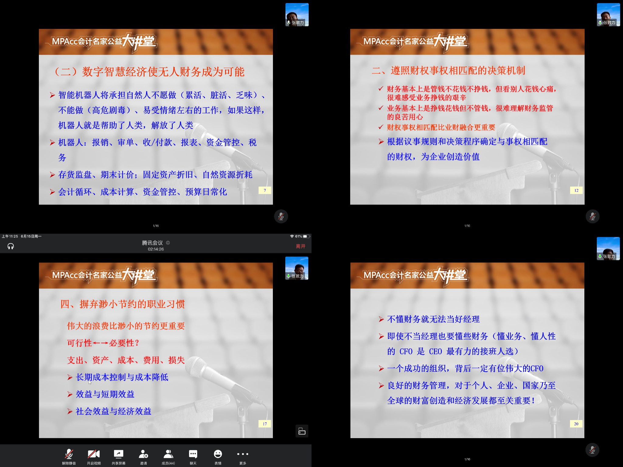 为加强我院会计专硕学科建设水平,提高会计专硕学生职业能力素养,6月15日上午,中南财经政法大学会计学院院长、全国会计专业研究生学位教育指导委员会委员、财政部首届全国会计领军人才张敦力教授,应我院邀请通过腾讯视频会议平台向我院MPAcc师生分享传递会计专硕专业建设经验,同时做了主题为《数字智慧经济时代财务管理创新》的会计大讲堂公益讲座。本次线上讲座与经验分享由我院副院长周运兰教授主持,全体会计专硕师生参与了此次讲座。