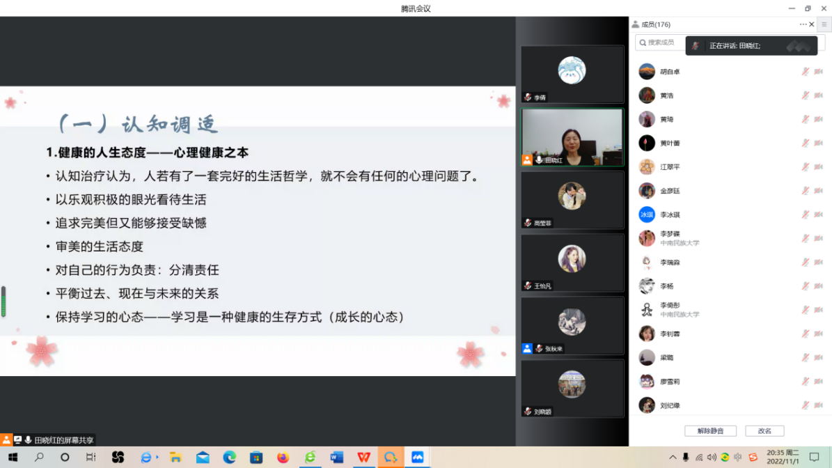 2022年11月1日晚上19点到21点整,我院特邀必赢官网教学名师、注册心理师、湖北省心理健康教育与咨询研究会副秘书长、教育学院田晓红教授开展线上的心理健康教育专题讲座。本次讲座由我院副院长周运兰教授主持,MBA中心主任张秋来副教授、2021级MPAcc专硕和2022级学硕、MPAcc与MBA专业研究生参与。