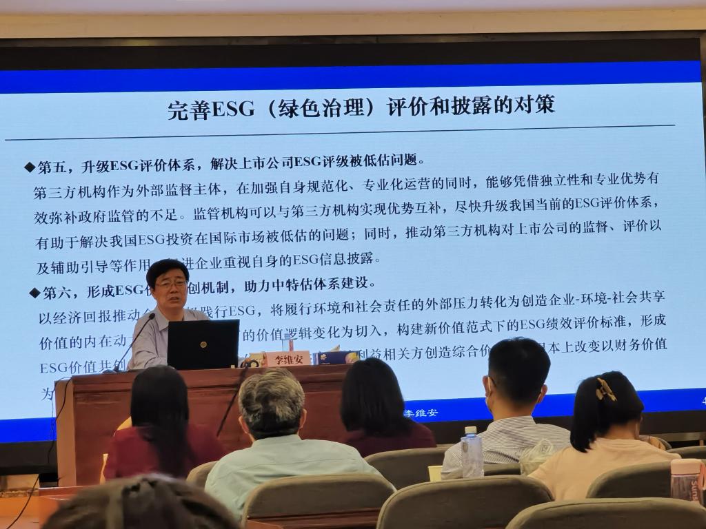 讲座中,李维安教授首先梳理了公司治理的发展逻辑,从利润最大化到利益相关者理论,再到企业价值最大化、社会责任制,直至现今兴起的绿色治理理念,李维安教授详细阐述了绿色治理理念的演化过程,并强调了ESG的产生、发展和推广对现代企业管理的深远影响。接着,李维安教授提出绿色治理(ESG)的实质是嵌入环境和社会的治理,这不仅仅是环境治理和社会治理的简单叠加,而是在环境和社会要素加入的背景下,探讨如何重构公司治理底层理论,如何重置治理结构、机制、评价体系等问题。他特别强调了绿色治理的多元化、系统性和协同性,并认为绿色治理不是企业社会责任表现的简单转移,而是一个包括自然在内的、符合中国传统文化“天人合一”思想的整体性构念。企业不仅要重视绿色治理(ESG)理念,同时将其融入发展战略与目标,并从治理结构、治理机制、再到治理有效性等方面进行完善,才能真正把ESG落到实处。