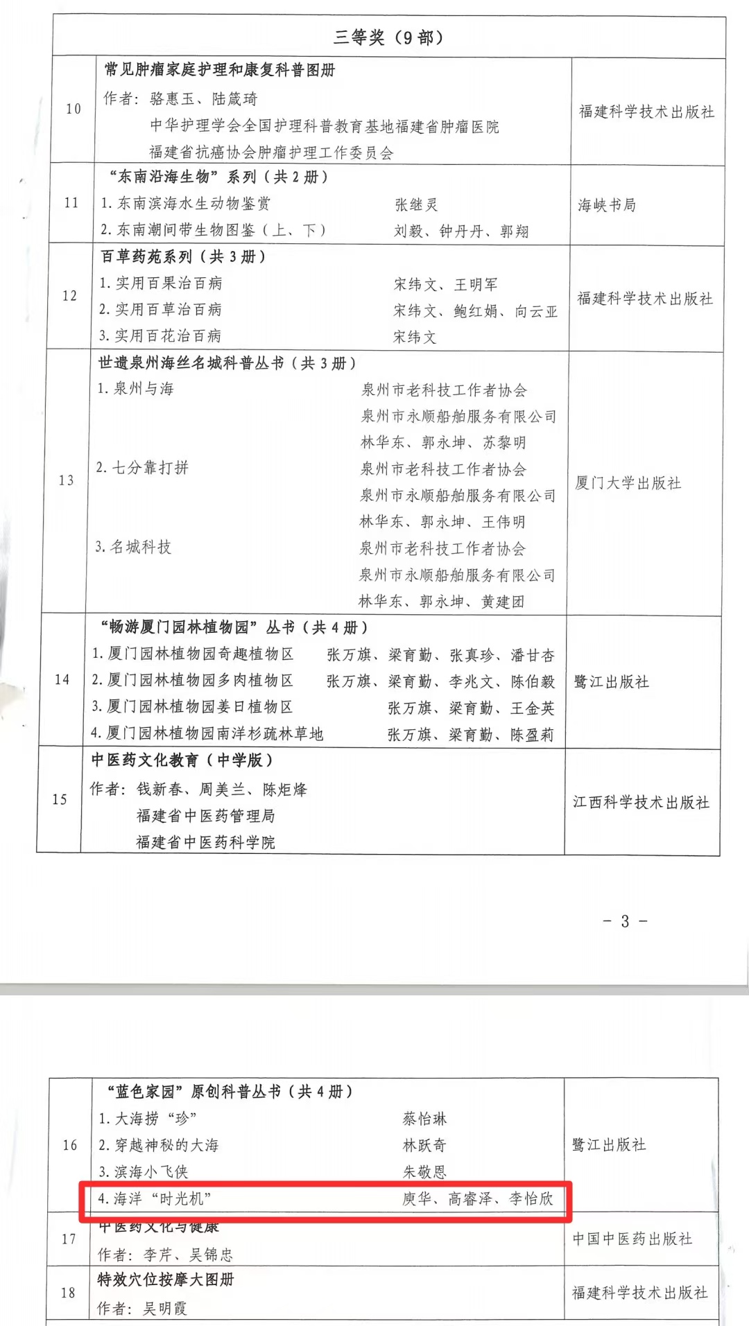 近日,福建省科学技术厅公布了2024年福建省优秀科普图书评选活动获奖名单。我院庾华教授主编的文物科普图书《海洋“时光机”》荣获三等奖。这是继《丝路流光:丝绸之路上的文物传奇》荣获第34届“金牛杯”优秀美术图书评选铜奖后我院科普著作的又一奖项,标志着我院科普创作迈上新台阶。