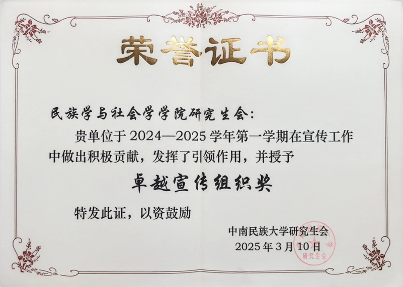 此次获奖是对学院深耕民族团结宣传工作的肯定,更是激励。未来,民族学与社会学学院研究生会将持续深耕“铸牢中华民族共同体意识”主题,以更生动的表达、更创新的形式,在宣传阵地上讲好学院故事,展示学生风采。(责编:席钰萍,审核:王璐璐,上传:杨科)