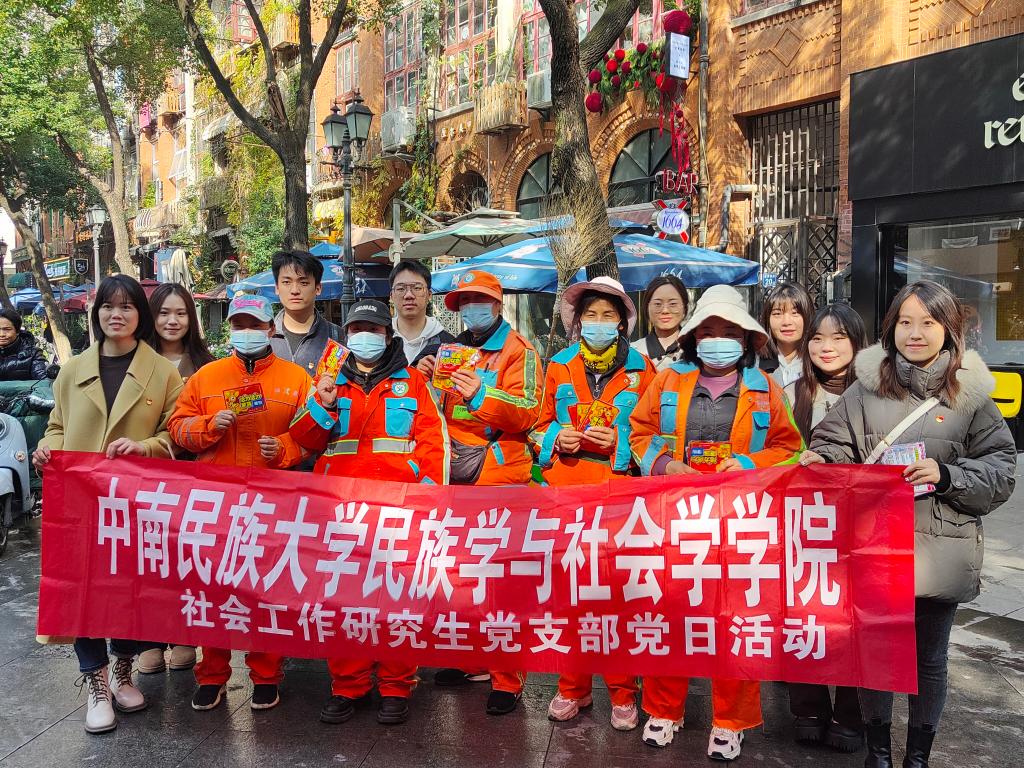 5日下午,在参观完武汉中共中央机关旧址后,支部党员们积极践行社会工作专业理念,为在寒冬中辛苦工作的环卫工人们送上暖冬物资,感恩他们的辛勤奉献。党员同志们表示在享受当下美好生活的同时,须意识到背后有一群勤勉的城市守护者们在默默地付出,在守护着这座城市的美好。