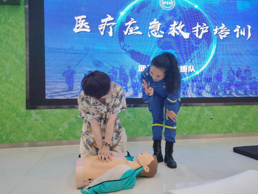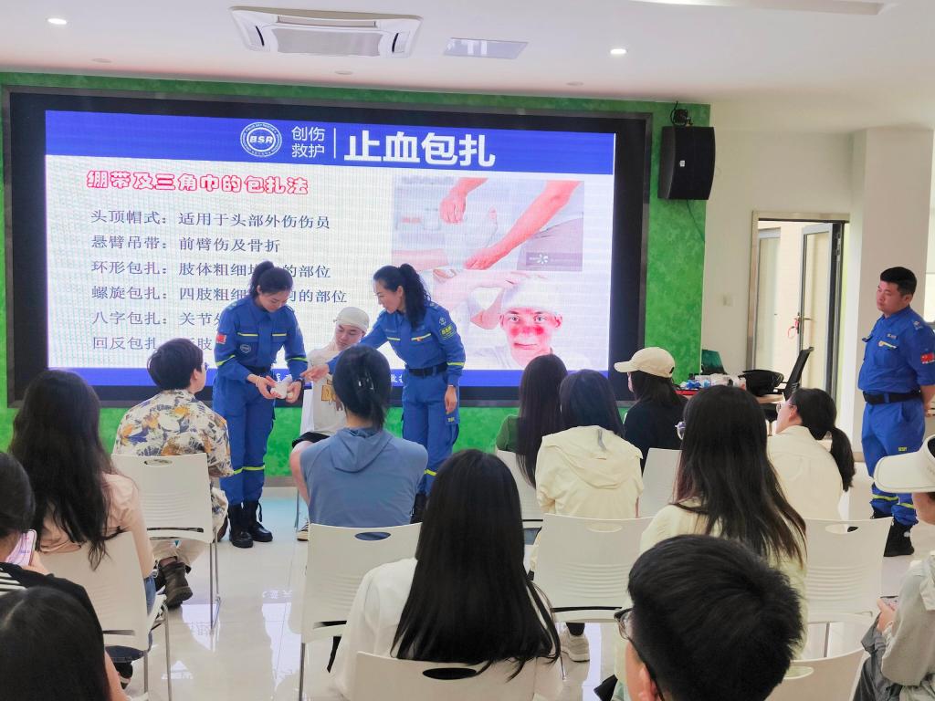 实践操作环节,党支部成员在蓝天救援队队员的指导下利用模拟人演练心肺复苏的操作手法,掌握三角巾、绷带对肢体不同部位的止血固定包扎技巧,了解自动体外除颤器(AED)的使用方法以及如何使用“生命地图”,掌握实施海姆立克法的注意事项……
