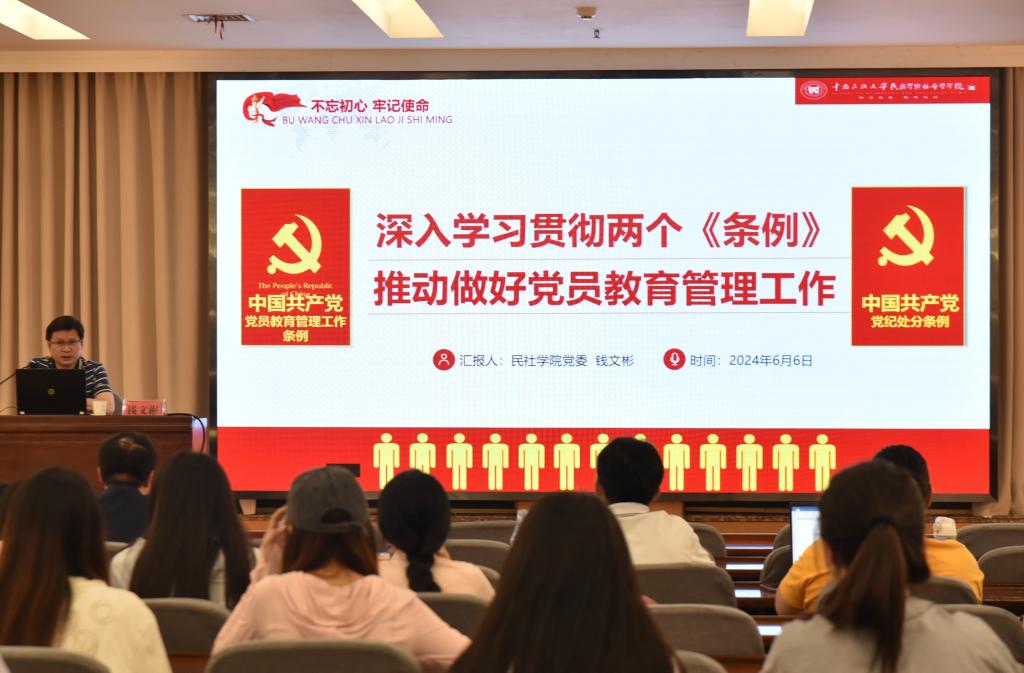 为进一步加强党纪学习教育,做好毕业生党员教育。6月6日下午,学院在润良报告厅开展毕业生党员“最后一课”主题党日活动,学院党委书记钱文彬以《深入学习贯彻两个〈条例〉推动做好党员教育管理工作》为题上专题党课。各党支部书记、纪检委员以及全体毕业生党员参加活动,活动由党委副书记王璐璐主持。