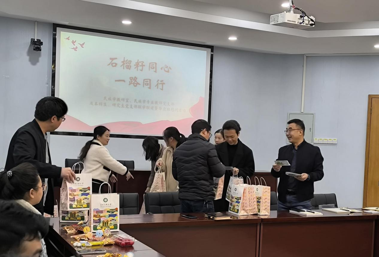 为传承“石榴籽精神”,深化民族团结教育,增进师生情谊,12月4日,民族学教研室携手民族学专业教师党支部及本科生、研究生党支部,在学院八角楼举办了一场主题为“石榴籽同心·一路同行”的民族学毕业班慰问暨各党支部联学联建活动。学院党委书记钱文彬、院长陈祥军、党委副书记王璐璐、民族学教研室教师代表及各支部党员代表出席了此次活动,21级民族学专业毕业班在校学生积极参与。