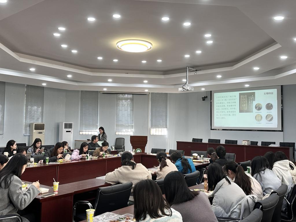 本次学习交流会以午餐会形式展开,围绕湖北省博物馆特色馆藏文物,例如越王勾践剑、虎座鸟架鼓、彩绘人物车马出行图等,由2024级民族学研究生刘星、罗小倩,2024级中国少数民族史研究生向筱毓、2022级民族学本科生吴雨阳、高月月和余影作为党员代表分别报告发言,介绍文物的前世今生,分享学习心得。民族学专业教师党支部王艳萍、马惠娟、刘丽娜、范英杰四位老师予以点评指导。其中范英杰老师就向筱毓同志分享的越王勾践剑内容特别强调,要结合民族学专业特色,透过文物本身的基础信息,辩证思考其背后所蕴藏的民族历史与文化内涵。