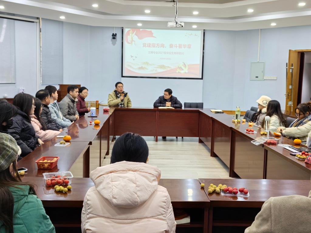 为帮助学生树立备考信心,全力冲刺考研,12月9日上午,文博教研室、历史文博专业教师党支部在八角楼报告厅联合开展了2021级文博专业本科生考研慰问活动。学院党委书记钱文彬、副书记王璐璐、历史文博专业教师党支部书记郑俊华、文博教研室全体教师及2021级辅导员出席,文博专业2021级考研同学参加此次活动。