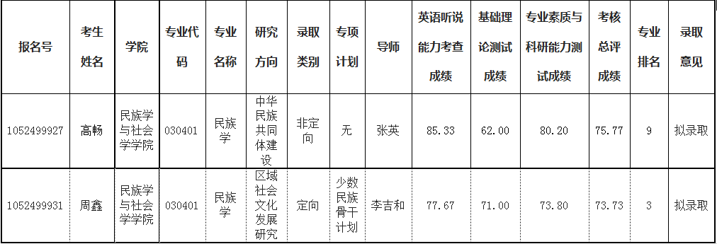 因报考民族学专业中华民族共同体建设方向的考生樊国杰放弃拟录取资格,经学院博士研究生招生领导小组研究同意,拟录取该方向高畅为博士研究生。