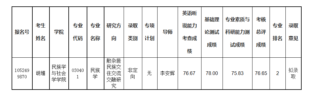 因报考民族学专业中华民族共同体建设方向的考生高畅放弃拟录取资格,经民族学一级学科指导组研究决定,学院博士研究生招生录取领导小组审批同意,拟录取民族学专业散杂居民族交往交流交融研究方向考生胡媚为博士研究生。特此公示。