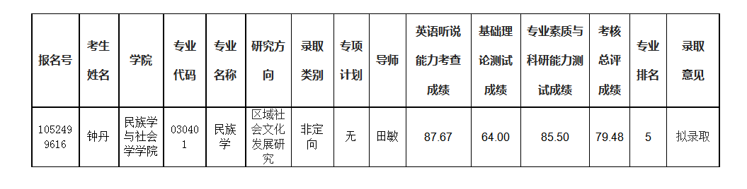 因报考民族学专业区域社会文化发展研究方向的考生周子翔放弃拟录取资格,经民族学一级学科指导组研究决定,学院博士研究生招生录取领导小组审批同意,拟录取民族学专业区域社会文化发展研究方向考生钟丹为博士研究生。特此公示。