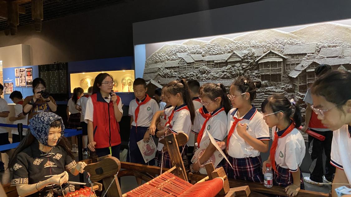 在讲解员引导下,师生们依次参观馆内七个主题展厅。从“美美与共”展厅里展现的中华民族大家庭图景,到“记忆武陵”中土家族三滴水床的木雕匠心、虎钮錞于的文化寓意,从“工艺奇葩”里马尾绣背带的精巧针法、毛南族斗笠的生活巧思,到“斑斓霓裳”中苗族百鸟衣的绚丽绣纹、瑶族服饰的精巧纹样,每一件展品都生动地诠释着中华民族的“多元一体”。