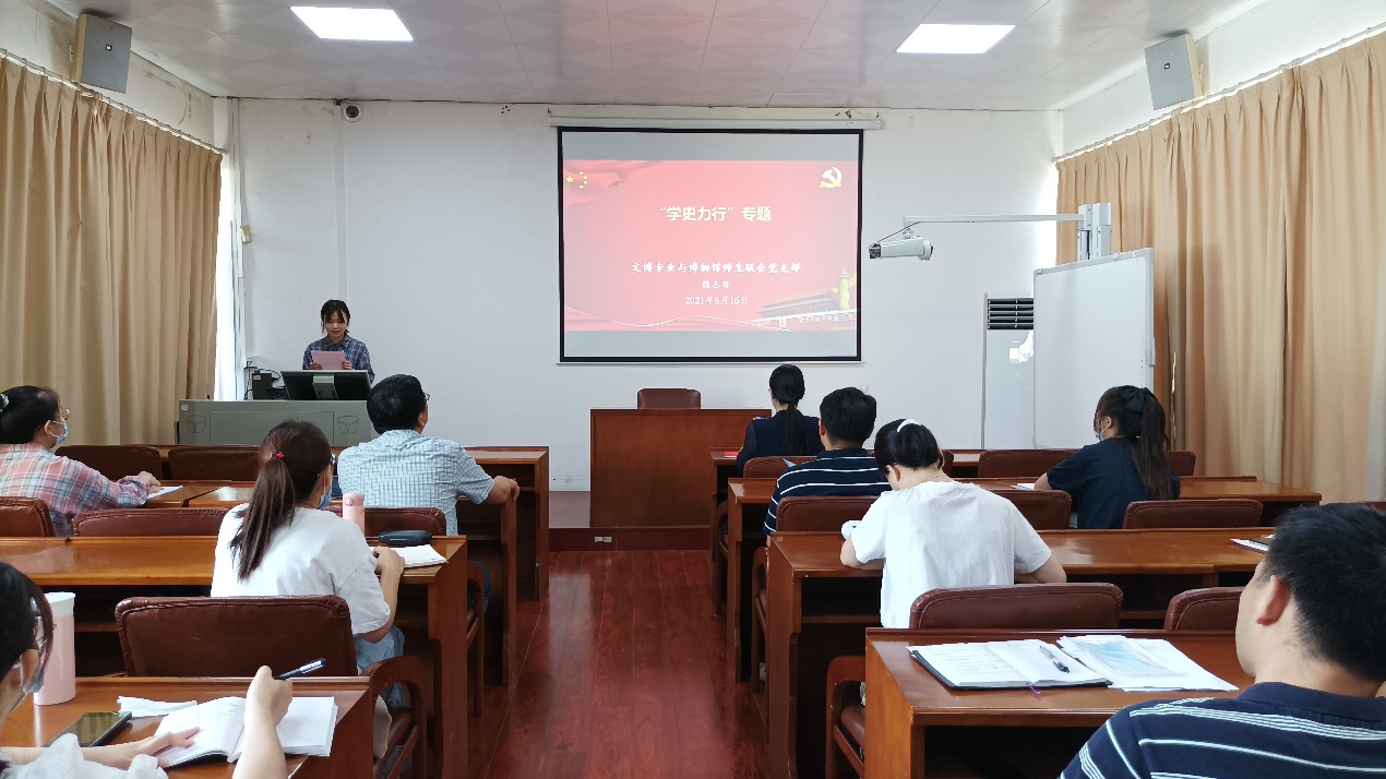 6月16日下午14:30,文博专业与博物馆师生联合党支部在博物馆二楼多媒体教室召开6月主题党日活动。此次主题党日活动是党史学习教育专题会议,分别以“明理”、“增信”、“崇德”、“力行”四个小专题开展,学习活动以书记讲党课和党员讲微党课形式开展。会议由支部书记林毅红同志主持,参与此次主题党日学习活动的有文博专业与博物馆师生联合党支部全体党员、文博专业预备党员、博物馆志愿者李晓鹏等同志。