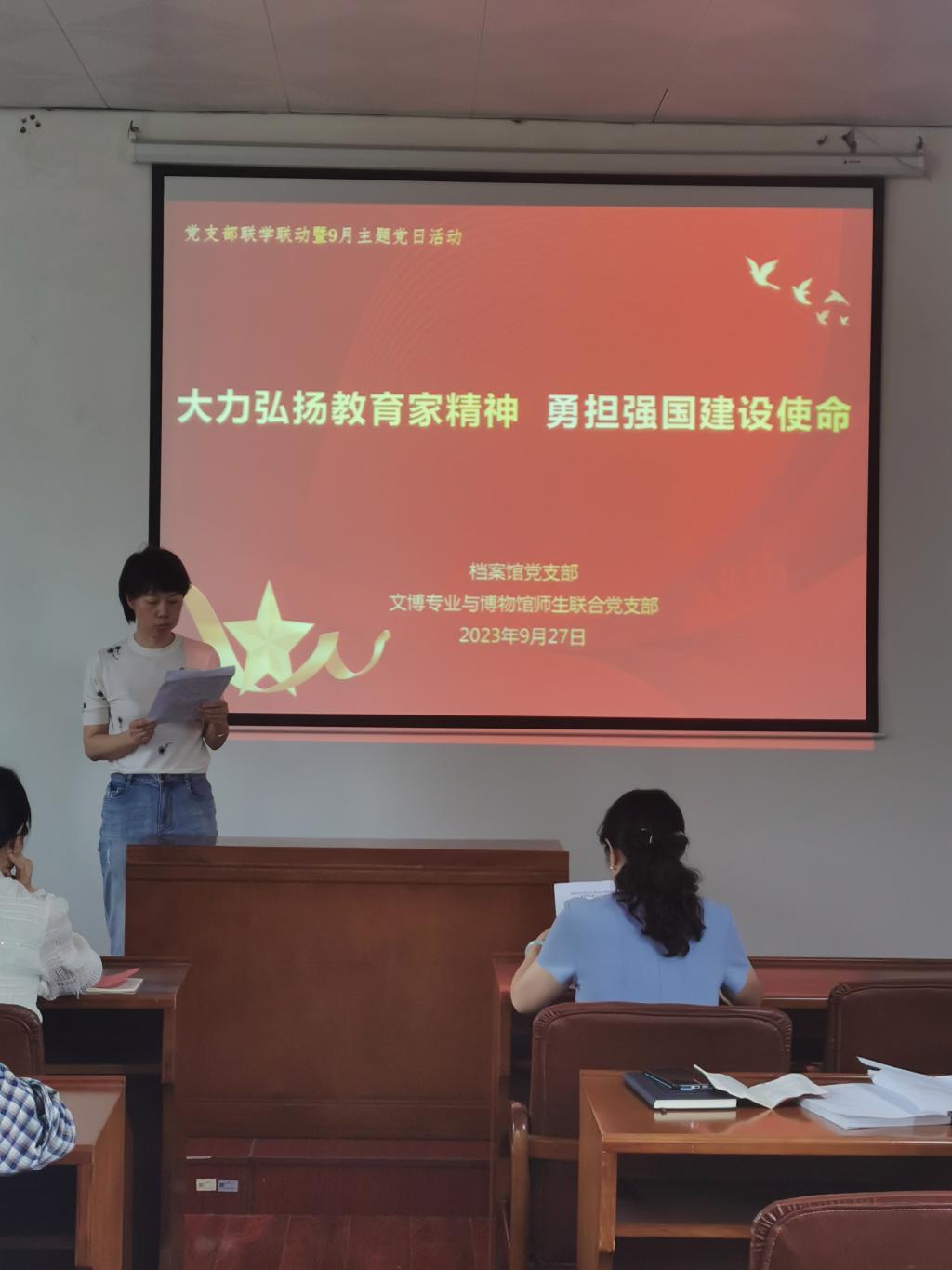 2023年9月27日下午,档案馆党支部和文博专业与博物馆师生党支部在民族学博物馆开展了以“大力弘扬教育家精神,勇担强国建设使命”为主题的党支部联学联动活动。活动由档案馆党支部书记樊俊主持。