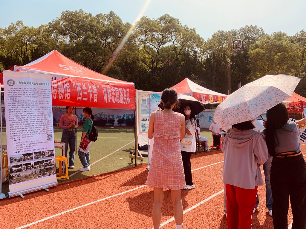 2022年9月10日-11日学校开展“百团大战”,各大社团齐聚南湖操场火热招新,我馆“西兰卡普”讲解志愿服务队也积极参与本次活动,参与摆台招新的志愿者们努力为志愿队伍寻找新鲜血液,壮大民博讲解志愿服务队大家庭。