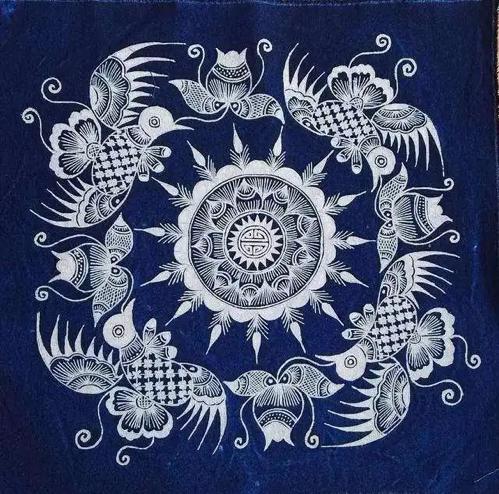苗族蜡染的工序从准备染料开始,接下来采集和发酵染料,然后就可以开始准备蜂蜡和铜刀,接下来开始画蜡,将蜡涂在需要保留色彩的地方或需要留白的地方后始浸染,浸染后就可以等待晾干然后冲洗脱蜡了。苗族蜡染具有悠久的历史,具有浓郁的民族特色。它的纹样特征是苗族民族生活、文化传统和美学思想的集中体现。首先,苗族的蜡染图纹,是贵州最具象征性的一种。苗族蜡染图案中,鱼纹图案是最普遍的一种,寓意着子孙满堂,子孙满堂。在苗族蜡染中,龙纹也是一个非常重要的图案,它有驱祸迎福、龙腾升达之意。另外,苗族蜡染图案多以鸟类图案为主,其活泼的图案表现出苗族人对生命的美好向往和希望。这种符号图案往往被赋予了一种特别的意义,它寄托了苗族人对生命的眷恋,以及对美好生活的期盼。
