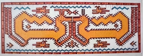 纹样上。润黎双面绣传统纹样主要有人形纹、大力神纹、龙纹和蛙纹等,是黎族传统的图腾符号和精神信仰,刺绣手法主要是在方形的几何格子内饰纹样,其构图左右对称均衡,图案圆润饱满。人形纹是双面绣的主体花纹,表现人物形象或人物活动,润黎常用人形纹来描绘生产生活中的场景,例如舞蹈、生产、婚嫁的场面来寓意人丁兴旺,表达幸福安康的美好愿景。润黎妇女常用大人套小人的构图方式,表现出来的人形纹形象高大威猛,以此来展示她们高超的构图驾驭能力。
