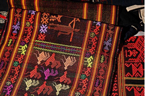 绣法上。“绣”是黎族织锦工艺的最后阶段,黎族双面绣是在织锦的正面绣图案,主要的针法有平绣、贴布绣、珠绣,用彩色丝线在面织锦的正反两面绣同样的花纹图案和颜色,是双面同形同色刺绣,正反两面针法一致,针脚均匀,疏密得当,线头和线尾均看不见,构图工整,色彩和谐,技艺十分精湛。