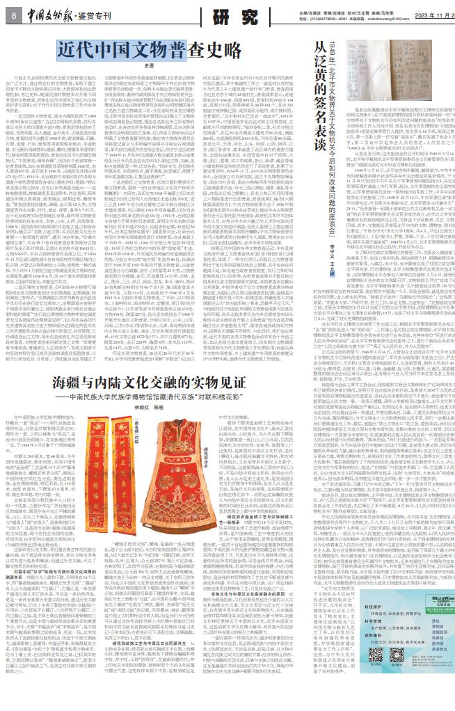 2023年11月28日,《中国文物报》鉴赏专刊研究栏目发表我馆林毅红、陈桂老师的文章《海疆与内陆文化交融的实物见证—馆藏京族对联和绣花彩》。