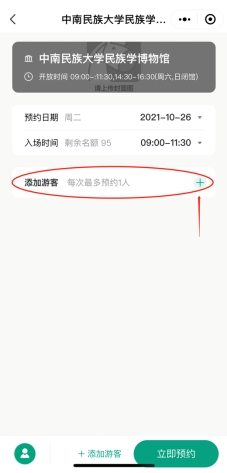 4.进入预约界面,选择参观日期及时间,点击“添加游客”。