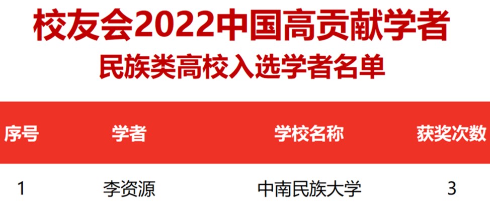 近日,作为社会各界认可的、有良好公信力的第三方大学评价机构艾瑞深校友会网正式发布“2022中国高贡献学者”榜单,民族类高校共有42名学者入选。其中,我中心主任、二级教授、博士生导师李资源因荣获3项奖励,位居中国民族类高校学者首位,荣膺2022中国民族类大学贡献能力最强学者美誉。