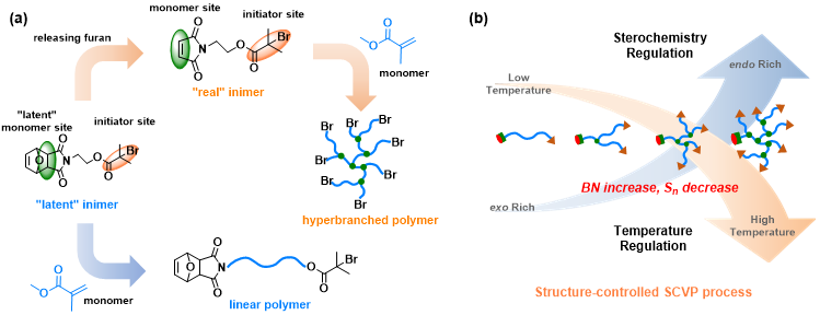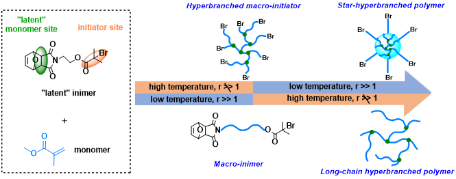 1.Diels-Alder动态化学可控制备策略(a)和通过反应温度和原料的立体化学结构调控超支化聚合产物拓扑结构(b)的原理图.