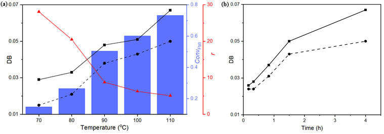 2.转化率、聚合速率比r、理论支化度(虚线)和实际支化度(实线)随反应温度的变化曲线(a)以及理论支化度(虚线)和实际支化度(实线)随反应时间的变化曲线(b).