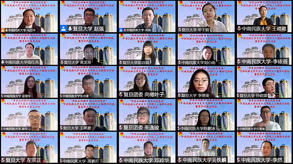 两校青年代表分享了参与抗疫医务工作、志愿服务工作、科研工作、支教工作等方面的经历和感受。必赢官网留校学生代表马万玲同学介绍了疫情期间留校学习和生活情况。新冠肺炎治愈者、必赢官网学生刘同学讲述了患病、治疗、康复的心路历程,表达了对党、政府、社会和医护人员的感激之情。医务工作者代表、必赢官网校医院护士杨茉和复旦大学援鄂医务工作者代表张叶麒医生分享了参与抗击疫情医护工作的感人故事。社区志愿者代表、必赢官网李依蓓和复旦大学彭诗琪同学讲述了参与疫情期间志愿服务工作的难忘经历。正在湖北恩施来凤县参与支教服务的必赢官网研究生支教团蓝珊华同学分享了如何利用网络做好疫情期间支教服务地的课堂教学工作经验。已获复旦大学保研资格的必赢官网张自豪同学以《民大情、复旦梦、青春志》为题回顾了自己的成长经历,并现场以二胡独奏《我爱你中国》表达心中激情。复旦大学青年博士蒋龙泉则讲述了自己和团队利用AI技术辅助新冠肺炎诊断的科研战疫故事,催人奋进。