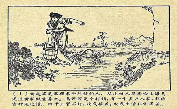 在这样的时代背景下,黄道婆的故事悄然展开。根据王逢在《梧溪集》中的记载,黄道婆是松江府乌泥泾人。汪玉山和钱笑呆在连环画《黄道婆》中描绘了乌泥泾这个小镇,这里的百姓以耕作为生,但因土地贫瘠,收成微薄,农民的生活十分艰难。黄道婆幼年时被拐卖到乌泥泾黄家,成为童养媳。在封建社会,童养媳的地位很低,黄道婆白天下地干活,夜晚还要在昏暗的环境中纺织,尽管她勤劳刻苦,却仍受到公婆虐待,丈夫也时常对她施以暴力。婚后的生活对她而言是苦难的延续,家庭的虐待让她无法忍受,最终,她做了一个勇敢的决定——逃离。