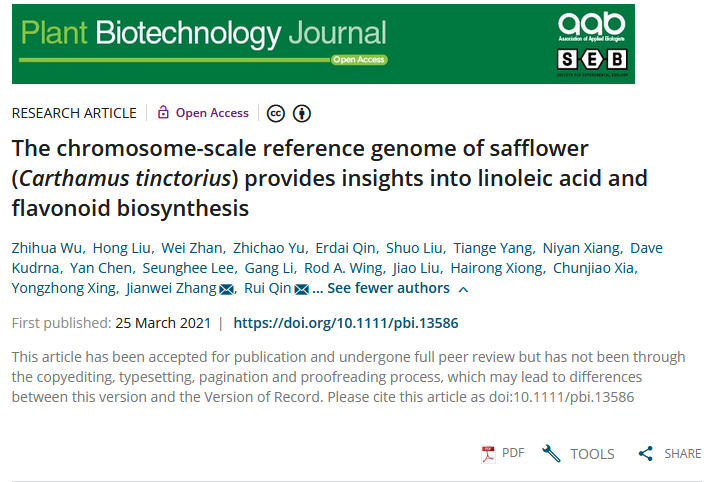 近日,必赢国际437官网生命科学学院覃瑞团队联合华中农业大学作物遗传改良国家重点实验室张建伟与邢永忠课题组在Plant Biotechnology Journal发表“The chromosome-scale reference genome of safflower (Carthamus tinctorius) provides insights into linoleic acid and flavonoid biosynthesis”的研究论文。
