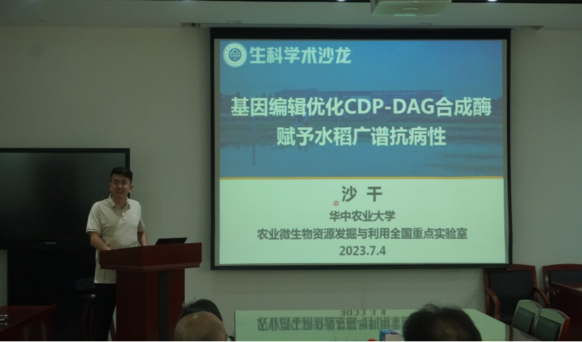 为加强学术交流,营造良好的学术氛围,7月4日,生命科学学院在学院206会议室举办了首届研究生学术沙龙活动。活动邀请到我院优秀毕业生、华中农业大学沙干博士做题目为“基因编辑优化CDP-DAG合成酶赋予水稻广谱抗病性”的学术报告。学院党委书记谢岚、院长余光辉、部分老师及50余名本硕博士生参加了本次活动,会议由副院长覃永华主持。
