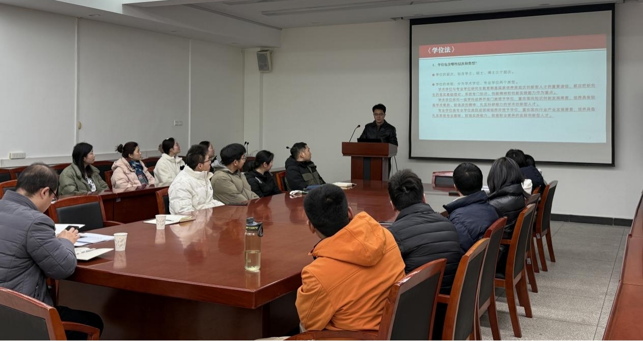 覃永华副院长带领全体研究生学习了《中华人民共和国学位法》的主要内容,强调了学位申请人应具备的学术道德和学术规范,要求研究生在学习过程中坚决杜绝抄袭、剽窃等学术不端行为,切实维护学术诚信和学术尊严。同时,覃永华副院长希望同学们尽早做好职业规划,转变就业认识,用好校园平台资源和相关政策,做好高质量就业。