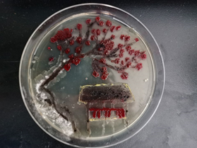 该作品秉承奋进新征程,建功新时代的理念,依据凤凰花主体象征社会主义的红旗迎风飘扬的创意构想。以接种环和无菌棉签为画笔,以红色灵杆菌,金黄色葡萄球菌等菌落产的色素为颜料,再经过恒温培养在LB培养基上依靠菌落自身形状特征逐步创作而成。