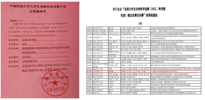 “芳林新叶催陈叶,流水前波让后波。”李献婷在科技创新的路上也小有成就。大二加入课题组,参与相关实验内容,参加第六届生命科学竞赛并担任队长带领队伍获得湖北省三等奖,参与第七届与第八届“互联网+”大学生创新创业大赛,参加大学生创新创业训练项目担任队长并立项。她研究萹蓄提取物对秀丽隐杆线虫体内抗氧化和抗衰老作用,并发现该提取物可改善脂质氧化,具有一定的抗氧化性;研究大黄酸对变形链球菌抑制作用,发现大黄酸抑制变形链球菌合成胞外多糖与gtfsmRNA表达受到抑制有关。