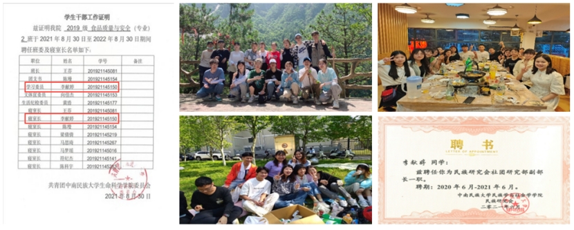 在学习之余,李献婷也积极参加学生工作,为大家服务。她曾任生科1905班纪检委员、食品1902级学习委员、寝室长、民族研究会研究部副部长。担任班委的职务,使她与同学更加熟悉,与老师有更深的交流。对民族学感兴趣的她,在民族研究会收获满满。在这个温暖的大家庭中,她了解到了不同民族风俗习惯,品尝了各民族传统美食,认识到了更多的朋友。