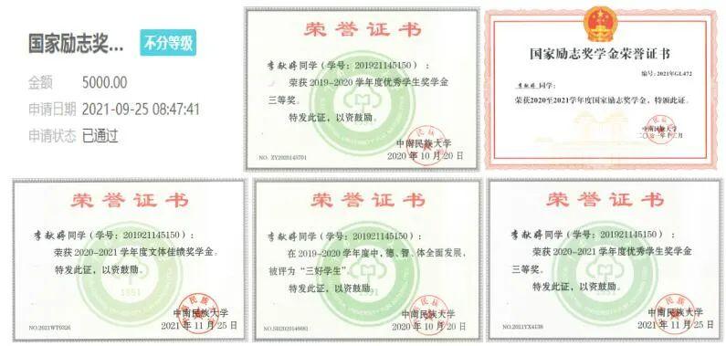 在校期间,她获得了课堂保卫战-笔记爱分享活动三等奖、2019-2020学年优秀学生奖学金三等奖、2019-2020学年优秀共青团员、2019-2020学年校级“三好学生”称号、2020-2021学年优秀学生奖学金三等奖、国家励志奖学金、2020-2021学年文体佳绩奖学金、第六届生命科学竞赛湖北省三等奖等荣誉。