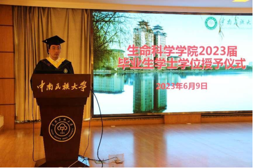 6月10日下午,生命科学学院2023届本科毕业生毕业典礼暨学位授予仪式在润良报告厅举行。副校长杜冬云、院党委书记谢岚、院长余光辉、院党委副书记邵国良、副院长谭艳平、毕业班辅导员方文杰和李泳璋老师、毕业班班导师、院党政办公室主任江华芳老师和学工办主任李茜老师出席仪式。