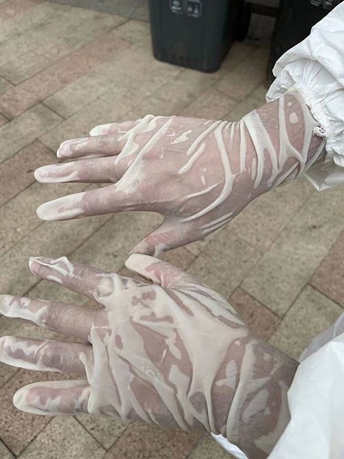 曲尼边久穿着防护服双手在手套里被汗水浸泡着