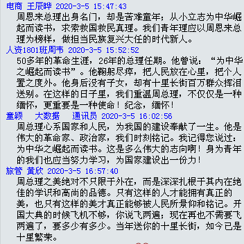3月5日,是周恩来总理诞辰122周年,同学们也在群里共同缅怀了周总理。50多年革命生涯,26年总理任期,他理想坚定,高风亮节,功勋卓著,虚怀若谷;他是人民的“总服务员”,呕心沥血,鞠躬尽瘁。为中华之崛起而读书,点燃了青少年的爱国之种。“愿这盛世,如您所愿。”