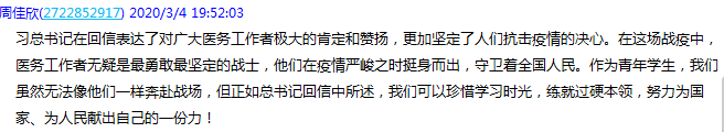 3月4日星期三晚上七点到八点,必赢国际437官网会计实验1801班在班主任和班委的发动下,全班同学在线上共同学习习近平总书记重要回信精神。大家踊跃发言、热情澎湃,畅所欲言。我们从回信中我们看到了习近平总书记对加强与完善西藏医疗队伍、提升医疗水平的殷切期待,了解了各族青年人在国家危急时刻的使命担当。同学们纷纷表示,一方面学习医护人员的大爱精神,另一方面珍惜时光,练好本领,发挥己用,贡献力量。