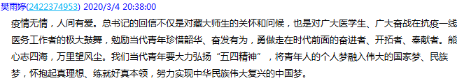 2020年以来,我们似乎被一个叫“新型冠状病毒肺炎”的疾病困住了,随着疫情的发展,武汉封城、延长假期、延迟复工、延迟开学,全国各地的医护人员纷纷奔赴疫区支援。近日,习近平总书记给正在北京大学首钢医院实习的西藏大学医学院学生回信,肯定他们献身西藏医疗卫生事业的志向,勉励他们练就过硬本领、服务基层人民,并向他们以及藏区各族群众致以节日的问候和美好的祝愿。时值藏历新年,回信在雪域高原引发热烈反响,同时也激发了全国青年学子的爱国与奋斗热情。习近平总书记的回信体现了党中央对医务工作者和少数民族群众的关心与关爱,激发了广大青年学子和各行各业劳动者以抗击疫情的白衣天使为榜样,将奋斗成果写在祖国大地上的决心。