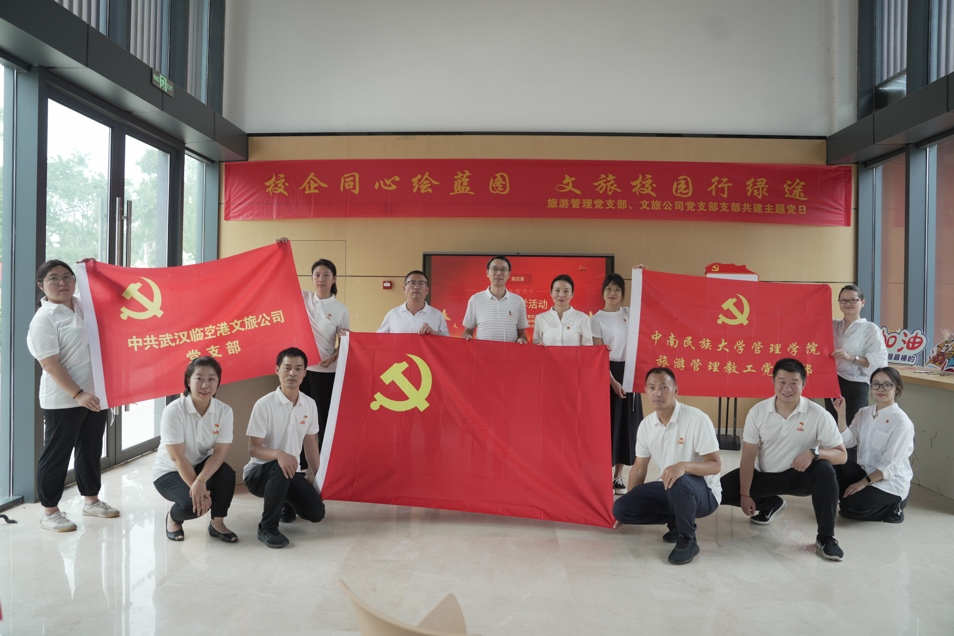 2024年6月26日下午,在中国共产党成立103周年之际,我院旅游管理教工党支部与临空投文旅公司党支部在东西湖梧桐雨公园联合举办了以“校企同心绘蓝图 文旅校园行绿途”为主题的支部共建活动。
