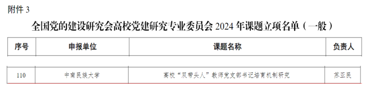 2024年12月5日,全国党的建设研究会高校党建研究专业委员会公布了2024年课题立项结果,财会教工党支部书记苏亚民教授申报的“高校‘双带头人’教师党支部书记培育机制研究”课题获批一般项目立项。