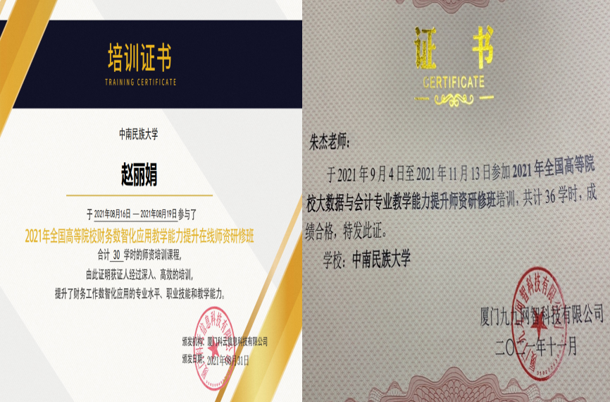 2021922日至2021924日苏亚民老师参加“企业财务与会计机器人应用职业技能等级证书”师资培训,获讲师证书。20218-20222月,苏亚民等多名老师先后参加2021年全国高等院校财务数智化应用教学能力提升在线师资研修班、2021年全国高等院校大数据与会计专业教学能力提升师资研修班、2022年全国高等职业院校财务数智化应用教学能力提升在线师资研修班,均顺利结业,经过深入、高效的学科交叉能力培训,提升了财务工作数智化和财务大数据PBI应用的专业水平、职业技能和教学能力,为培养数智财务复合型人才做好充分的师资储备。