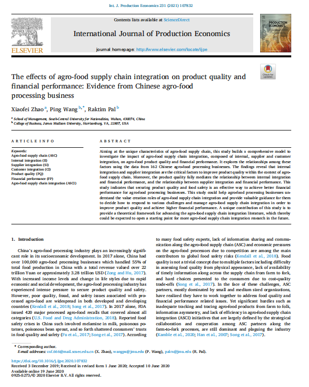 The effects of agro-food supply chain integration on product quality and financial performance: Evidence from Chinese agro-food processing business