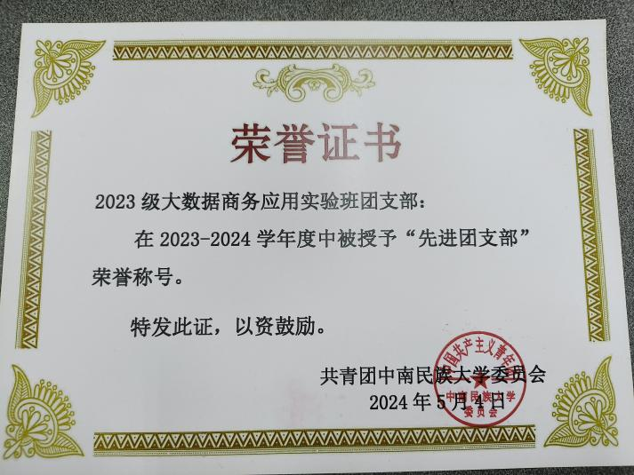 日前,在2023-2024年度必赢国际437官网共青团先进集体评选中,信管专业23级大数据实验班荣获“先进团支部”称号。自班级成立以来,2023级大数据实验班始终保持朝气蓬勃、进取向上的优良作风,在信管教研室的引领和辅导员、班导师的指导下,全体同学共同努力,在思想建设、学风建设、实践活动等方面都取得了不错的成绩。
